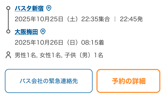 緊急連絡先の確認方法は? 2026年03月02日 02:52 更新 予約確認メールもしくはマイページでの確認が可能です。【マイページでの確認方法】マイページにログインする予約履歴にある該当の予約「バス会社の緊急連絡先」をクリック バス会社名、緊急連絡先をご確認いただけます。 関連 当日 緊急連絡先